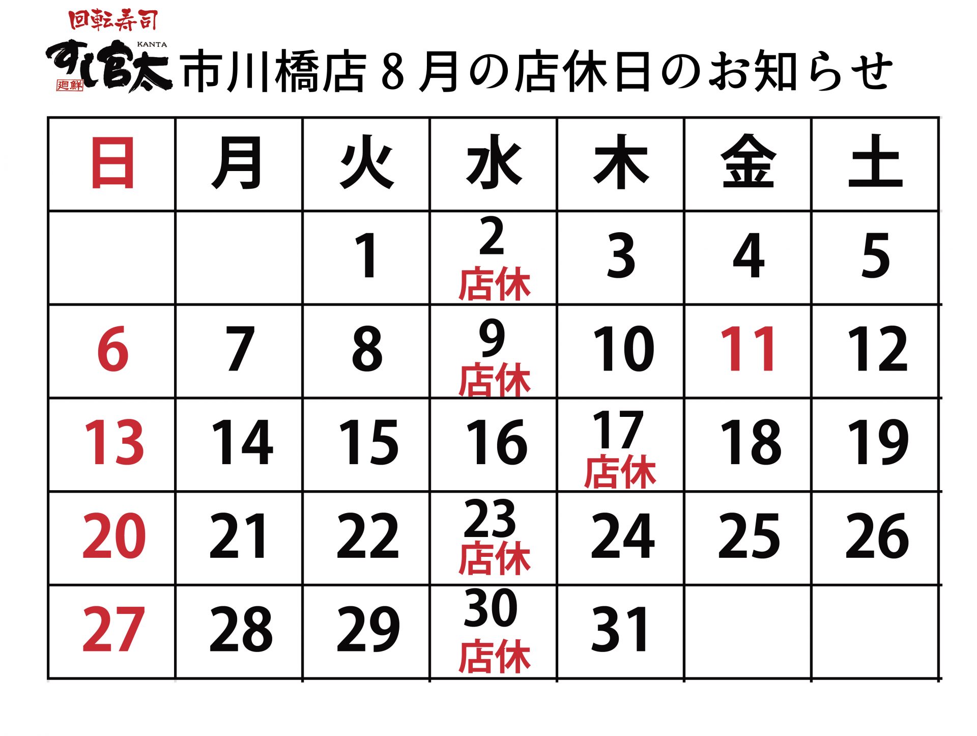 市川橋店 8月の店休日のお知らせ