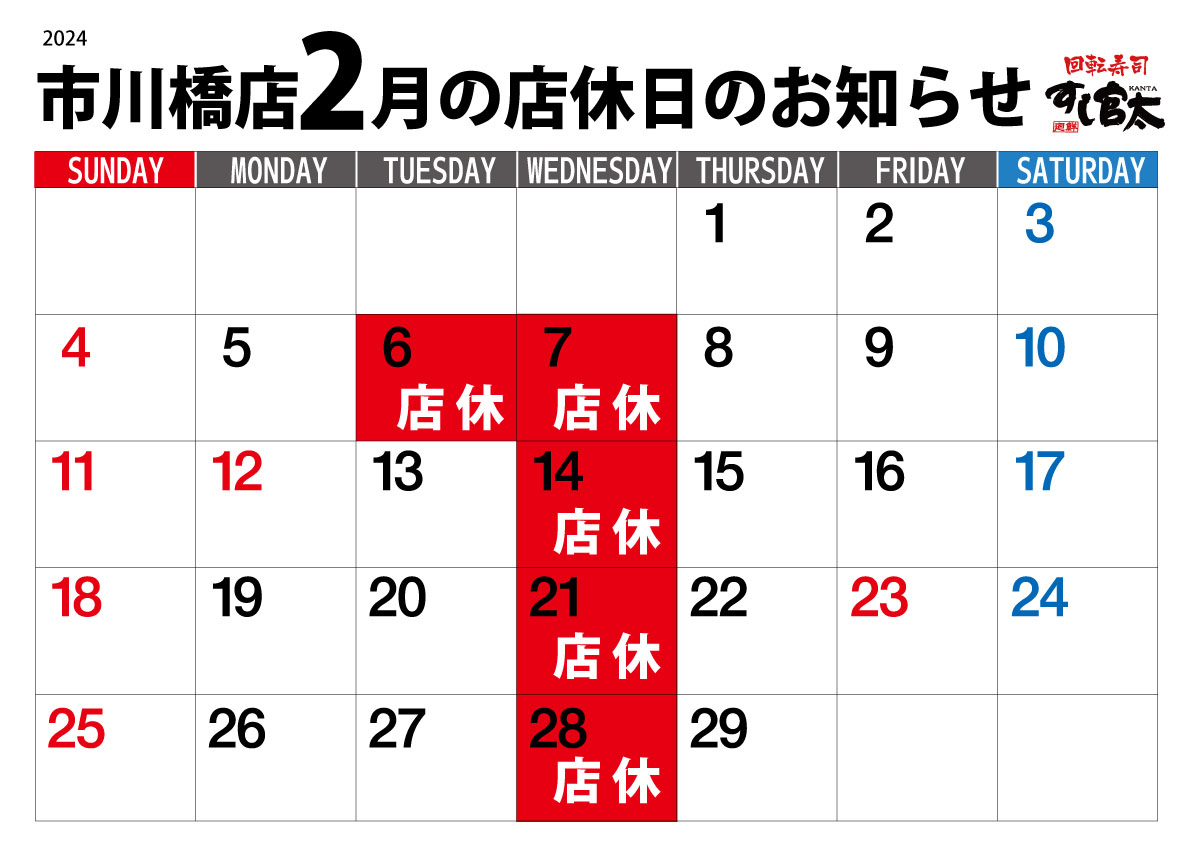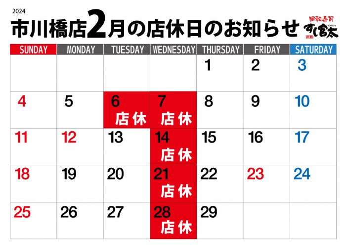 市川橋店2024年2月店休のお知らせ 下のカレンダーの日時で休業とさせて頂きます。(6・7日は社内研修となります)大変ご迷惑をお掛け致しますが、何卒ご理解とご協力を賜りますよう、宜しくお願い申し上げます。ご利用よろしくお願いいたします。 Tweet 2024.01.12 « 氷上店2024年2月店休のお知らせ 一覧へ 2月3日節分の日(土)はテイクアウト販売のみとなります »