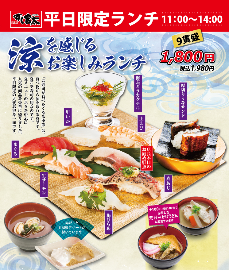 夏バージョン涼を感じるお楽しみランチ 9貫盛 1,800円(税込1,980円)