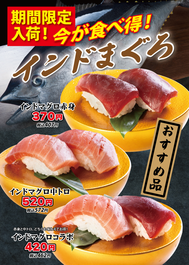 期間限定!インドまぐろ 期間限定入荷!今が食べごろです!インドまぐろインドまぐろ赤身 370円(税込407円)インドまぐろ中トロ 520円(税込572円)インドまぐろコラボ 420円(税込462円) 赤身と中トロ、どちらも味わえてお得! Tweet 2025.10.03 « 秋を味わう お楽しみランチ 一覧へ 蟹の季節がやってきました! »